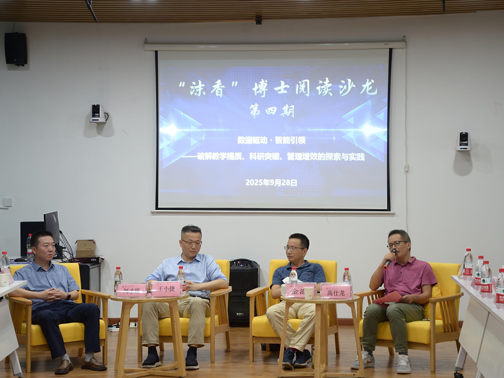 本网讯(文/郑爱菊 图/李延林)9月28日晚,图书馆在108-5室成功举办第四期“沫香”博士阅读沙龙。本次活动以“数据驱动・智能引领:破解教学提质、科研突破、管理增效的探索与实践”为主题,特邀北京邮电大学人工智能学院王小捷教授、我校电子信息与人工智能学院院长金澎教授、信息技术与实验保障处处长刘才铭教授、数学与统计学院高仕龙教授担任论坛嘉宾。党委教师工作部副部长但强、教学部副部长李磊、人工智能教育与应用中心副主任张波、图书馆、档案馆直属党支部书记邹大勇出席活动,教学院14位博士代表及50余名学生代表现场聆听。活动由图书馆、档案馆馆长龙述君主持。